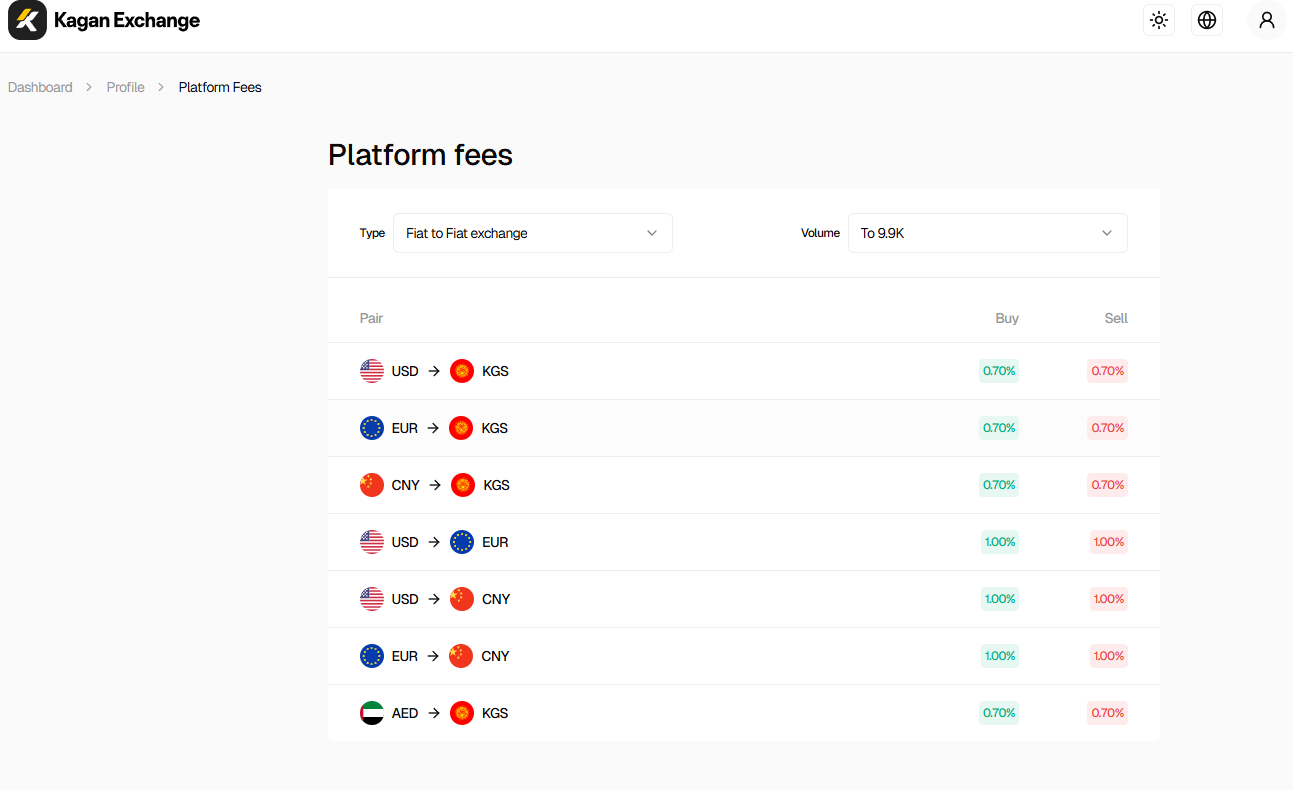 Detailed fee information is available in the profile section under Platform Fees. Fees can be filtered by operation type and volume.
