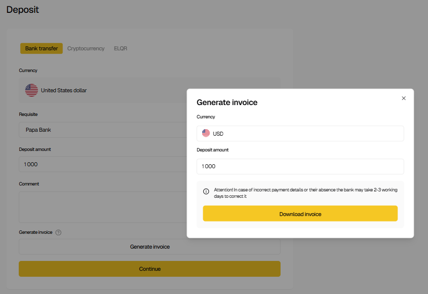 - Complete the bank transfer using the provided requisites.